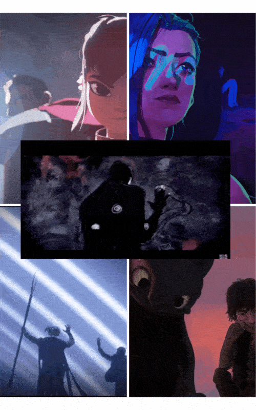 Nimona is an animated one off film, with a unique, almost flat looking animation. I love both the style and how they've used small techniques to tell a story. For example, throughout the film lighting is used to show who is good and who is bad. This has influenced how I think about art, composition and visual storytelling.Arcane